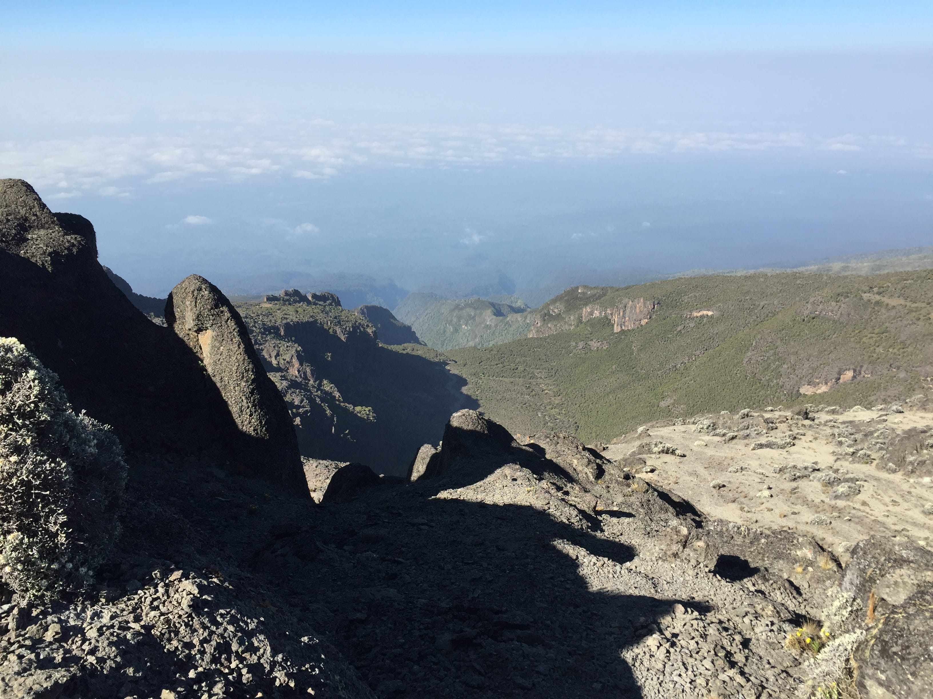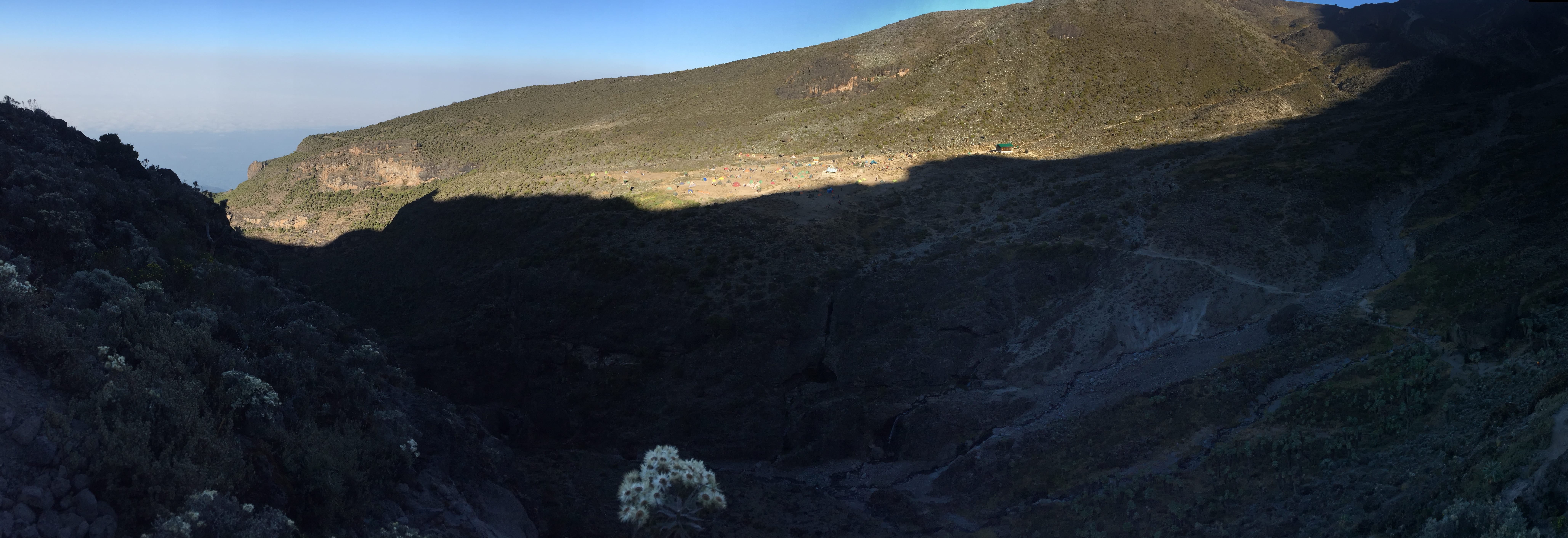 As we approached a surprisingly green valley, squinting, in the distance I could make out a camp. Could it be the Barafu Camp already? We had only been walking for an hour but we were told to expect a quieter day. Turning to our guide he dashed our hopes with one sentence. This wasn’t Barafu. It was the Karanga Campsite and the tents we could see being erected were for groups that were doing the 8 day Machame trek. This camp is the extra night stop to help acclimatisation. Because we were all heading on to a week’s safari after our little adventure on the mountain we were on the 7 day Machame Trek. But all was not lost; this was to be our lunch stop before a final push onto Barafu Camp. Just as we were processing this news the trail evaporated in front of us, disappearing down the walls of the valley we had, until now, not been able to see. Lunch was now over an hour away. Time to take on some water and descend into the valley.