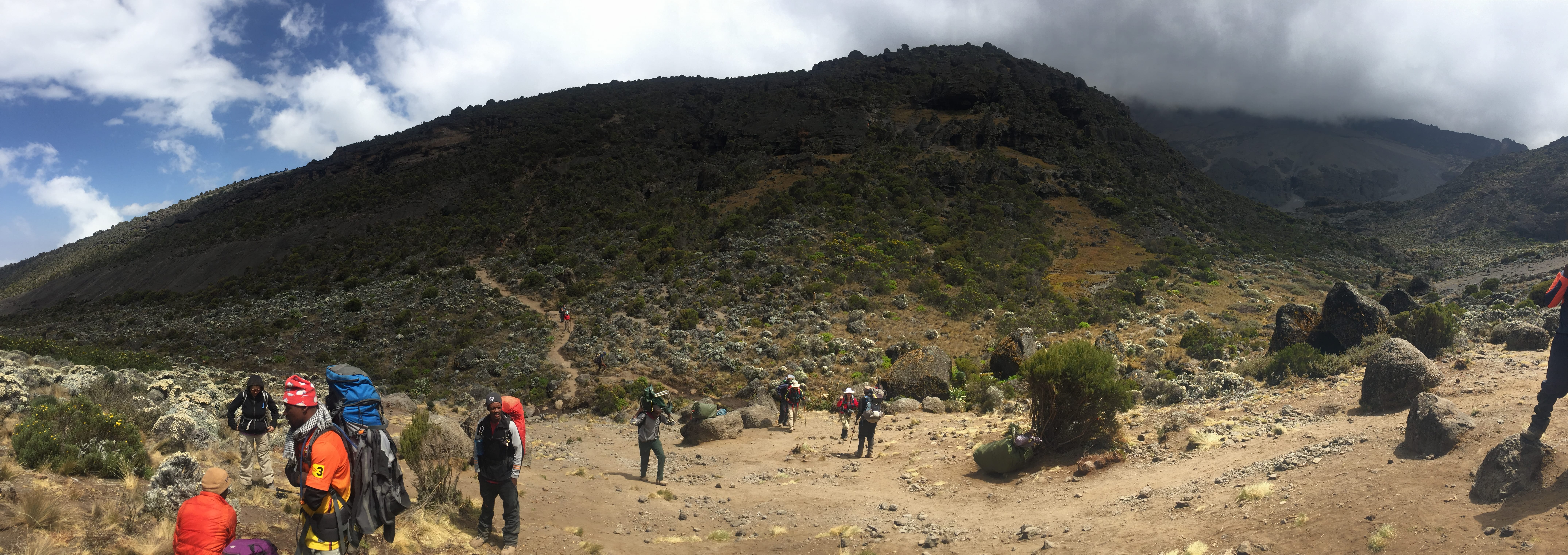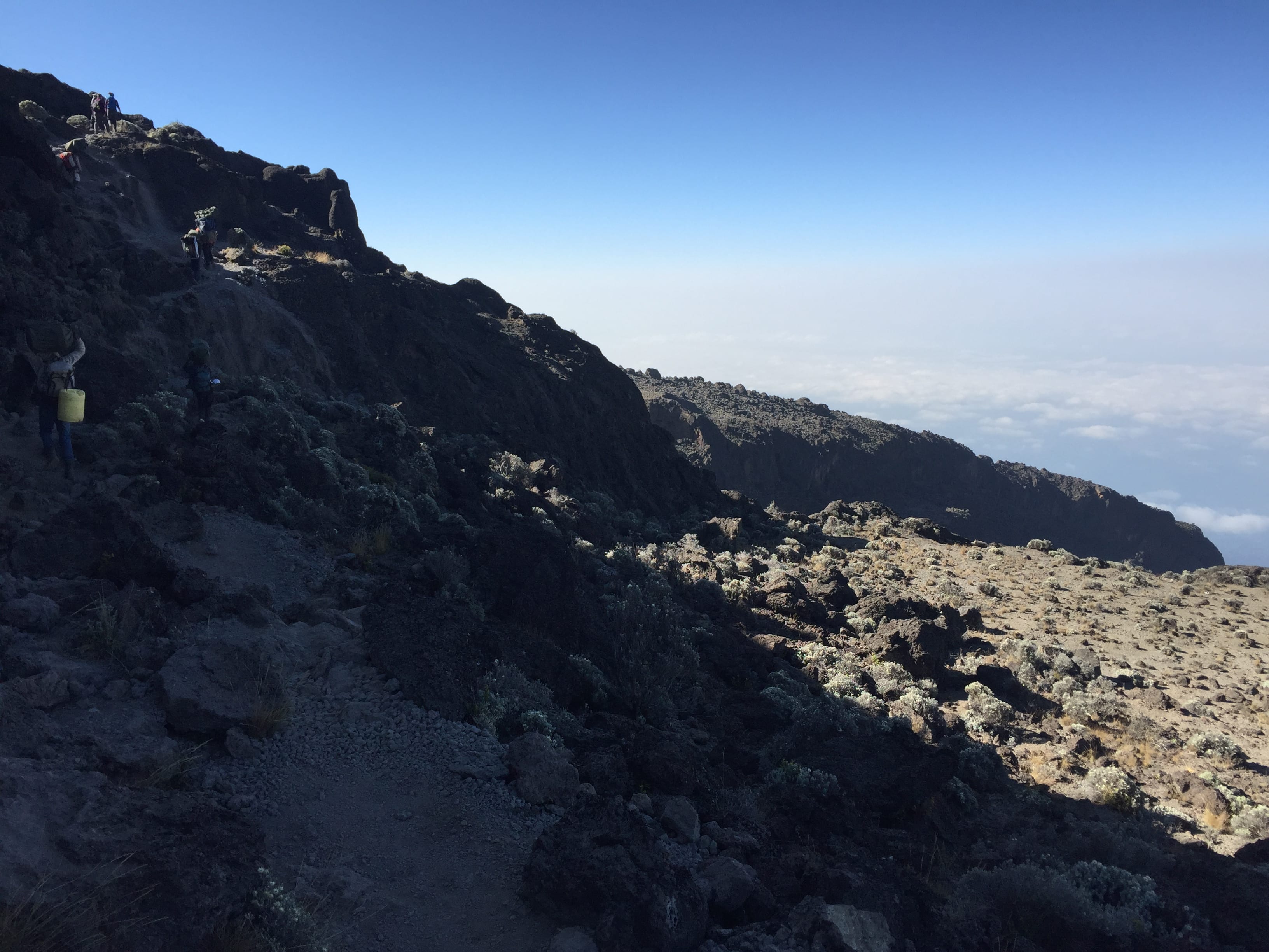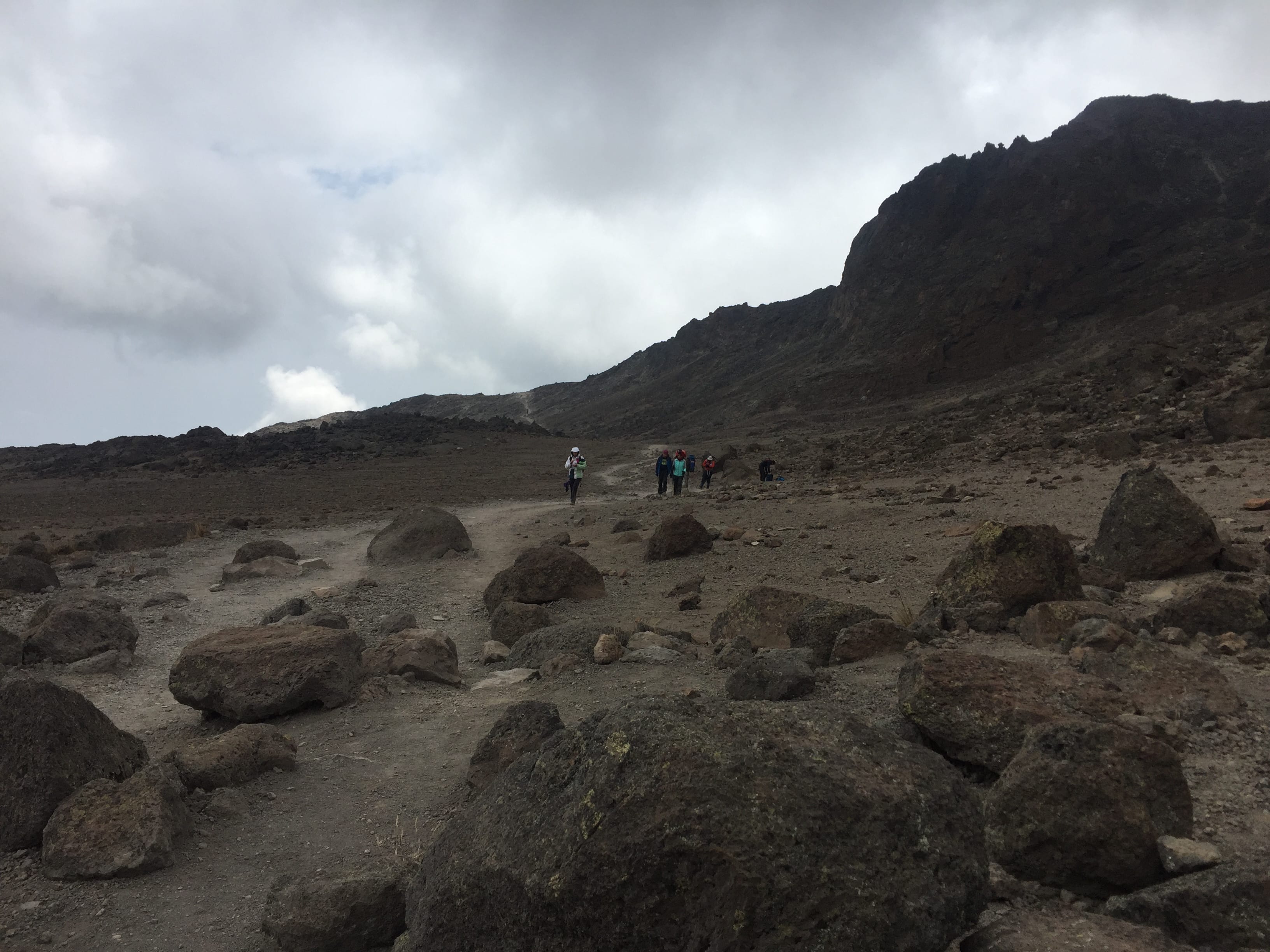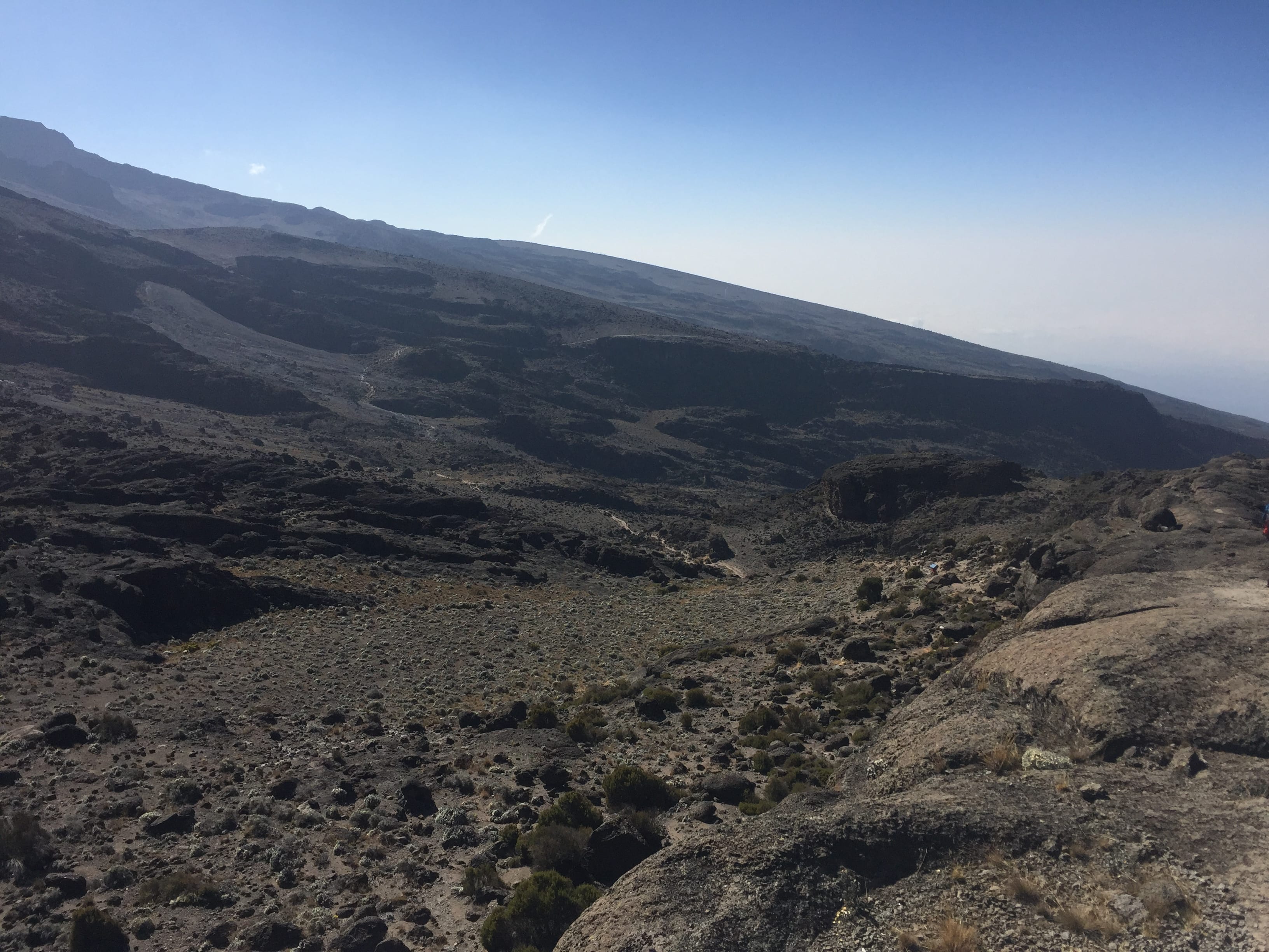But first the beautiful Karanga Valley spread out around us. As soon as you think this mountain can’t possibly have any more surprises left, it throws another curve ball at you. Above us the southern flank of Kibo peak still looked down on us ominously, daring us to take it on. Ahead of us the pathway once again disappeared into a pinpoint far in the distance. It was clear that today was far from over, even though it felt like it was nearly dinner time. In actual fact , even with our 15 minutes of celebration, it had only just gone 9am. What a way to start a day.