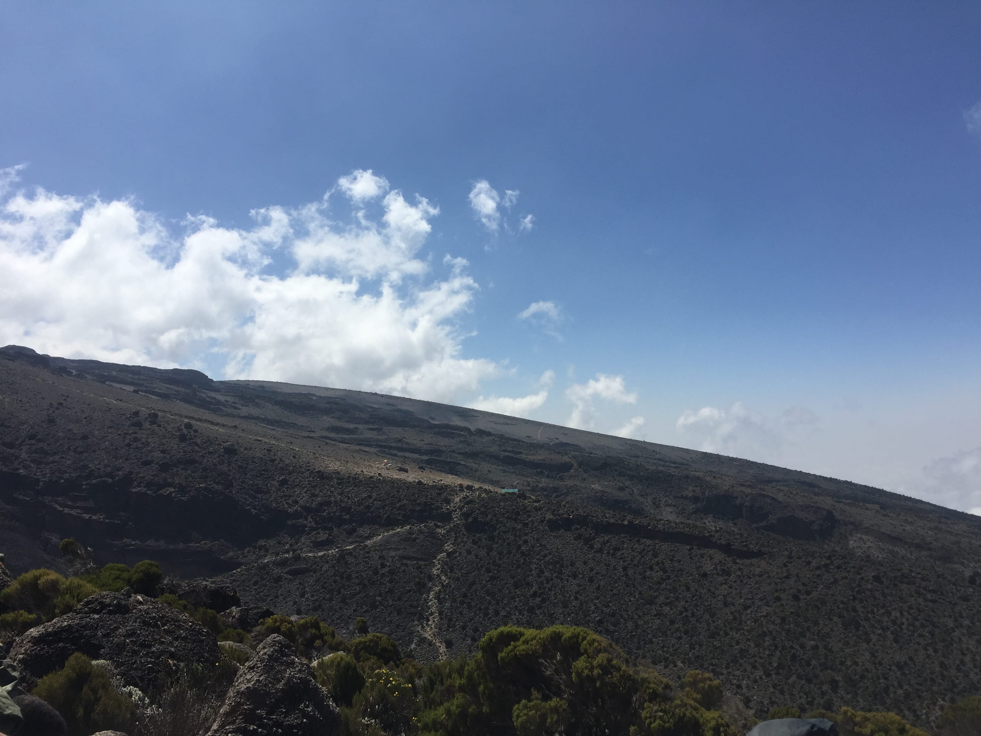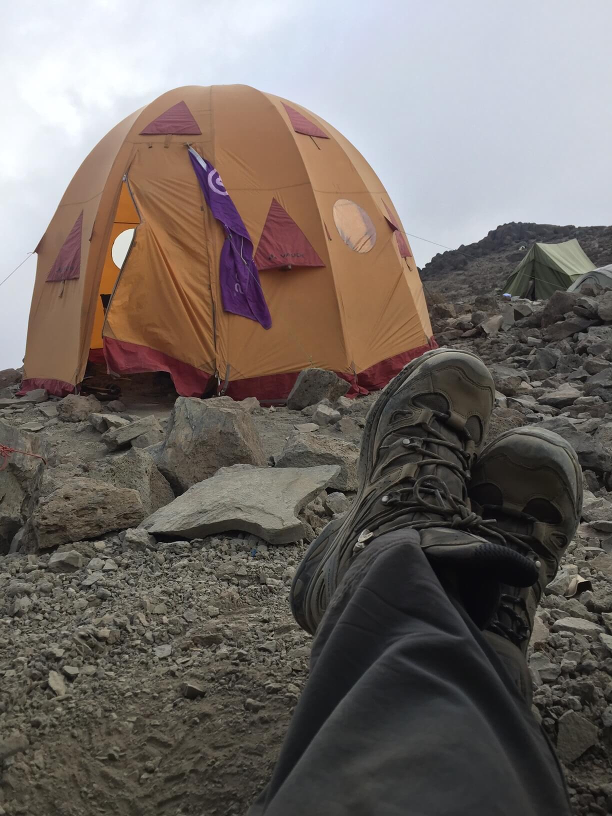 We had all but slowed to a crawl, walking for 10 minutes before needing a short break to catch our breath. My legs felt like lead weights and all I wanted to do was sit down and have a power nap. I felt like a person double my age. I was trying to think about something, anything, to get my mind off the relentless yet painfully slow progress we were making when all of a sudden I spotted something bright orange on the ridge above me. I thought briefly that it was another flower until I realised that at this altitude it would be impossible. It was the first tent of Barafu Camp.