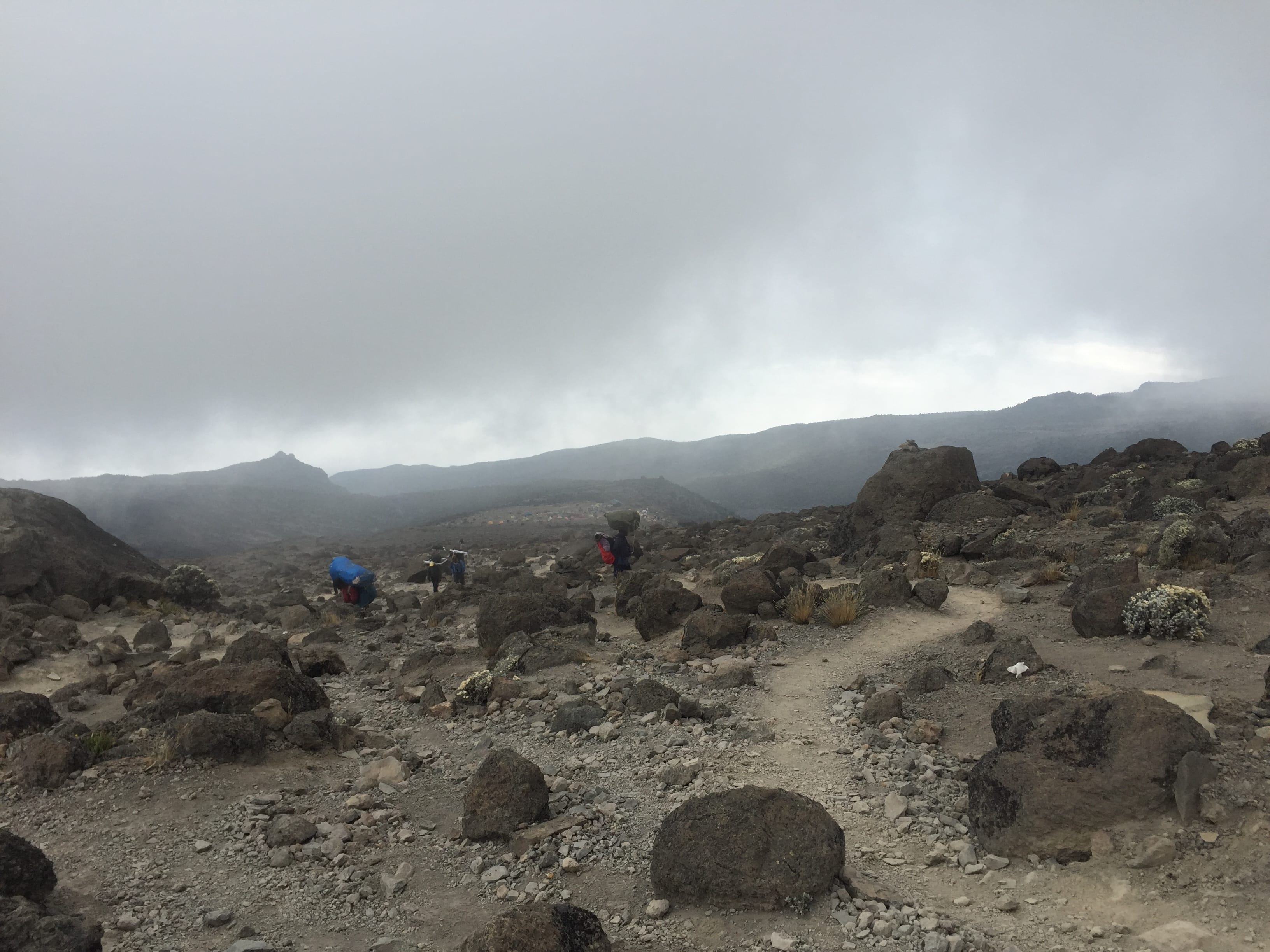 Sitting in the tent eating one of the best stews that had ever touched my lips, the wind was howling a gale once again outside threatening to lift our tent off its anchor points. We weren’t in a rush to leave but 90 minutes after we had clambered up the final ridge to the welcoming sight of the mess tent and wafting smells of lunch being cooked, we were back outside onto the bleak cloud covered mounting but in a surprise twist, instead of keeping to the same trail, alarmingly we headed north up a hidden trail and into the unknown. The relentless altitude gain wouldn’t end until we finally found our tents in the enormous Barafu Camp but, unbeknown to us, that moment was still 3 hours away.