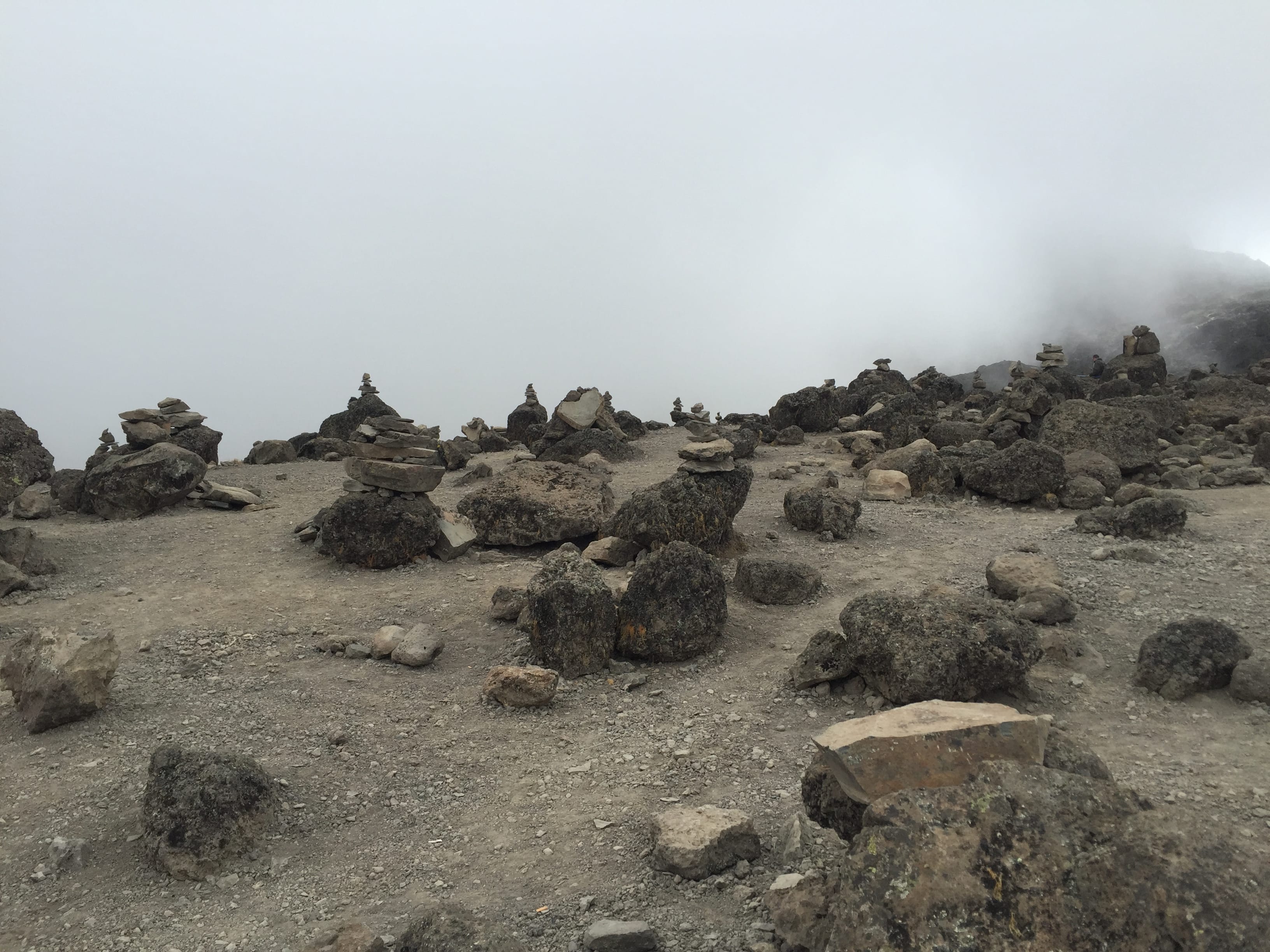 The cloud was billowing all around us although the wind had died down a little. The temperature was such a contrast from 2 hours ago while we were enjoying a sunny moment in the bottom of the valley before lunch. Today out of any of the other days on the mountain was living proof of the need to pack layers in your day pack. So far today I had been walking in long trousers and a fleece top, the fleece came off as we headed down into the valley shortly followed by the long zip off legs of the trousers which needed to be replaced as we approached Karanga Campsite. Now on a plateau an hour up from the campsite in almost whiteout conditions surrounded by stone monuments that are added to daily by the steady stream of hikers, the fleece had returned along with my waterproof overcoat for added warmth.