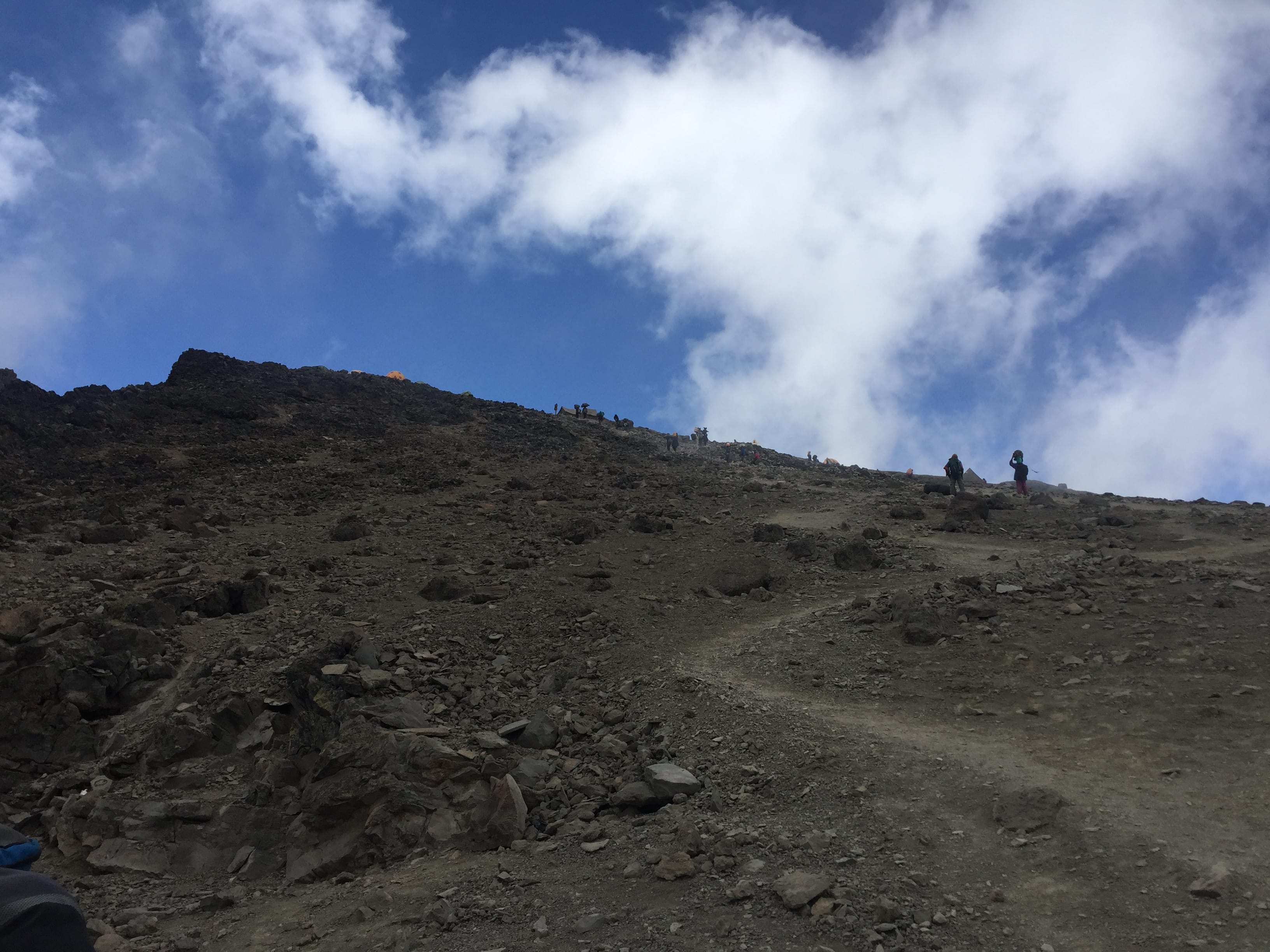 Clouds descend over the eastern flank of Barafu Camp. Even more precipitous that it looks here. Getting about is a challenge.