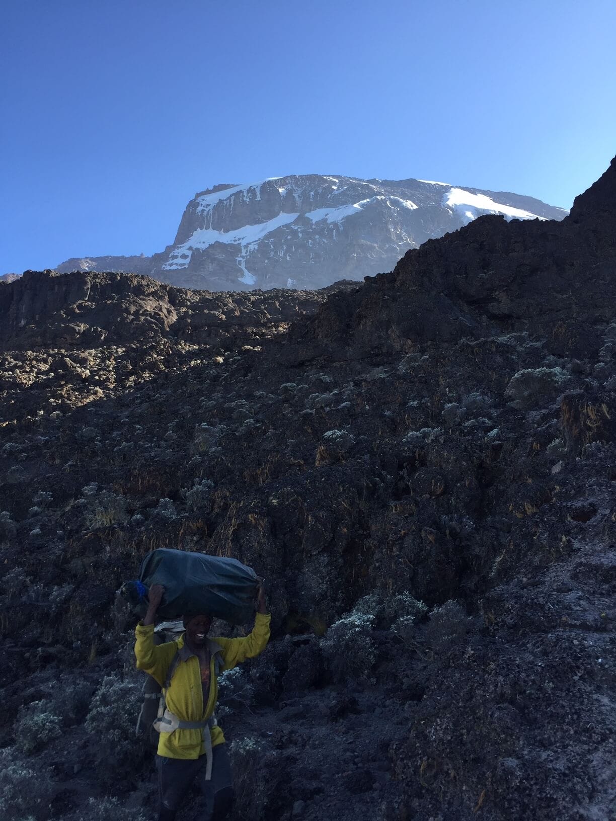 Our head porter, as always, smiling and showing us the way to do it. Carrying not only his kit but over 10kg of equipment while Kibo looks down on us all
