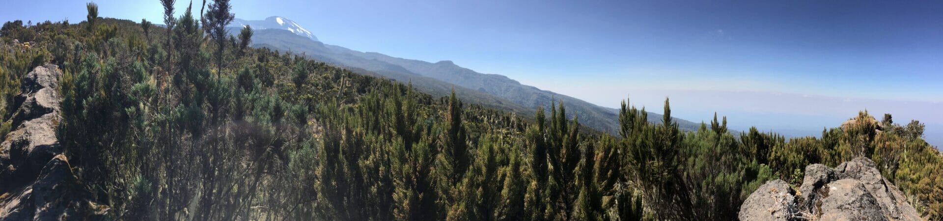 The cloud from the night before has evaporated leaving a breath taking morning vista of bright blue sky as a backdrop to the lush green forest that completely surrounds us. Turning north I stop momentarily. What I think is our ultimate goal, Kibo Peak is finally visible for the first time. Way off in the distance, glaciers clinging to its side, it looks so damn far away and oh my god so high. How on earth are we going to get up there over the next 4 days?