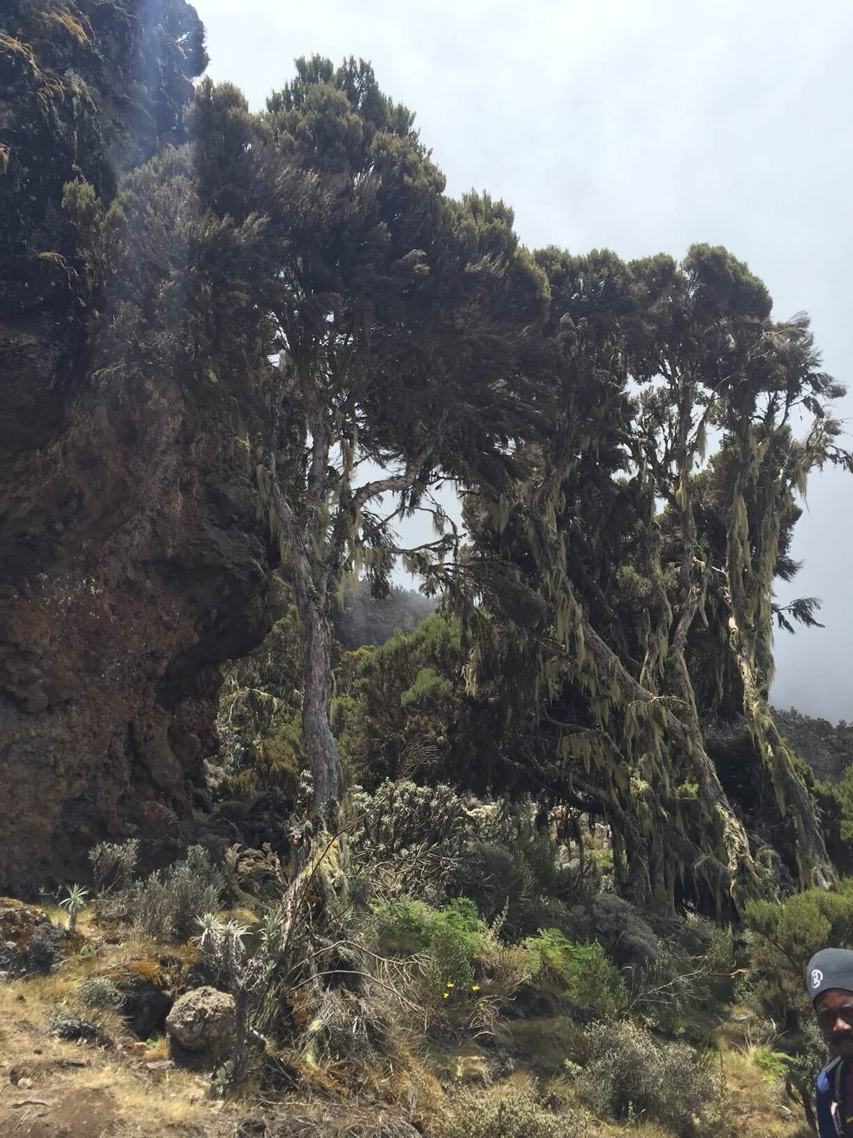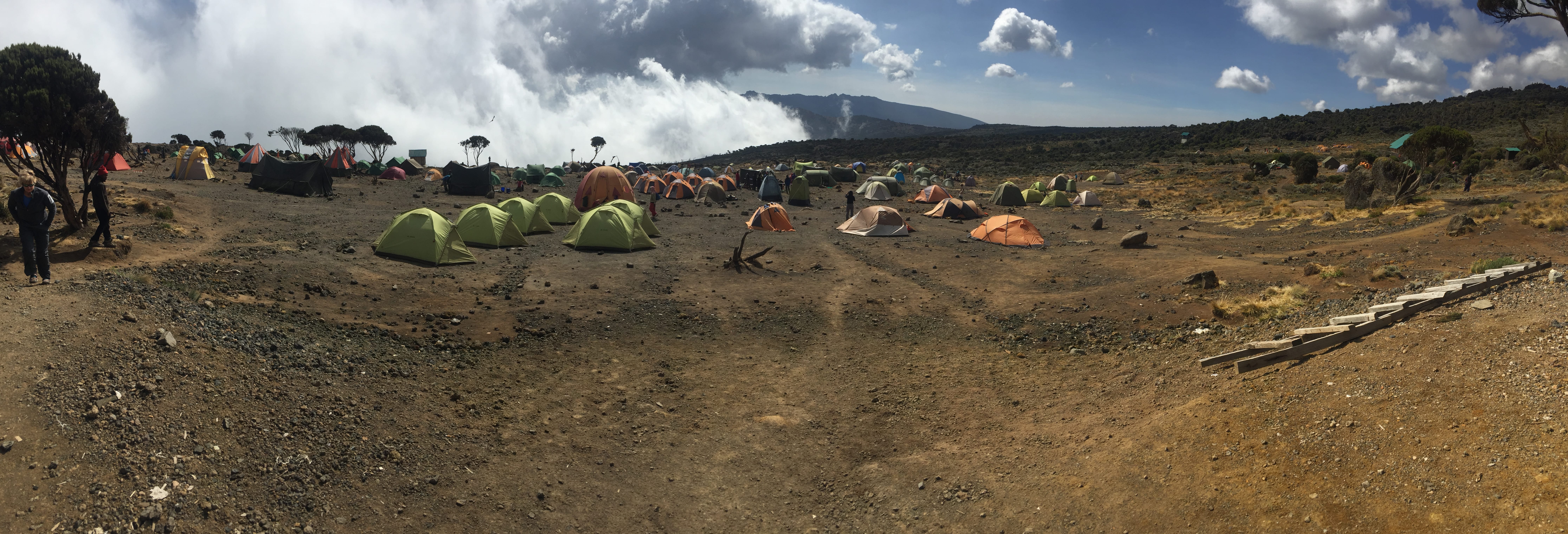 Concentrating more on the increasingly steep pathway I look up momentarily to be greeted with moss covered trees clingingly perilously to cliff edges as the wind blows the cloud strikingly fast past us. The day has been long as I begin to wonder if we will ever reach Shira Plateau. This has been the longest 5km of my life. Some like to play music as we hike but I prefer to experience all the senses around me, the smell of the dampness in the air, the sound of the wind blowing, the breath taking sight of the mountain landscapes all around us but as the camp finally came into view through the billowing cloud the had enveloped us for the better past of the last hour, my body was telling me enough was enough for the day.