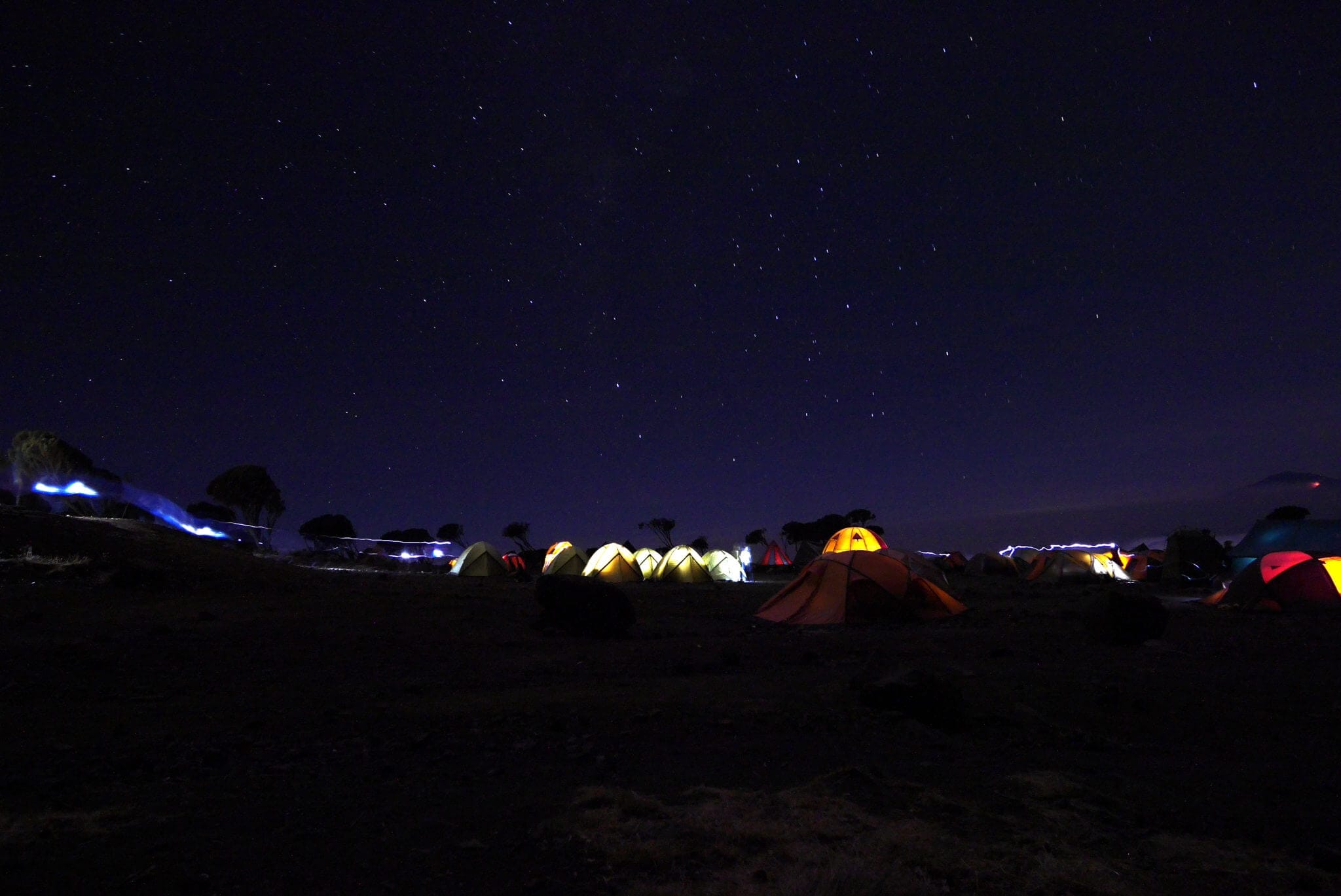The evening brought with it one of the darkest nights skies I had seen since I had walked the Inca Trail in Peru 4 years previously. We were camping above the cloud layer for the first time. Aside from the early morning and late afternoon mists covering Kibo peak we would be very lucky with the skies for the rest of our time on the mountain. After dinner I felt compelled to try and record life on the mountain resulting in my only night time image with the lights inside everyone’s tents lighting up like beacons against the clear star studded night sky. To this day it is one of my favourite memories of my time in Tanzania.