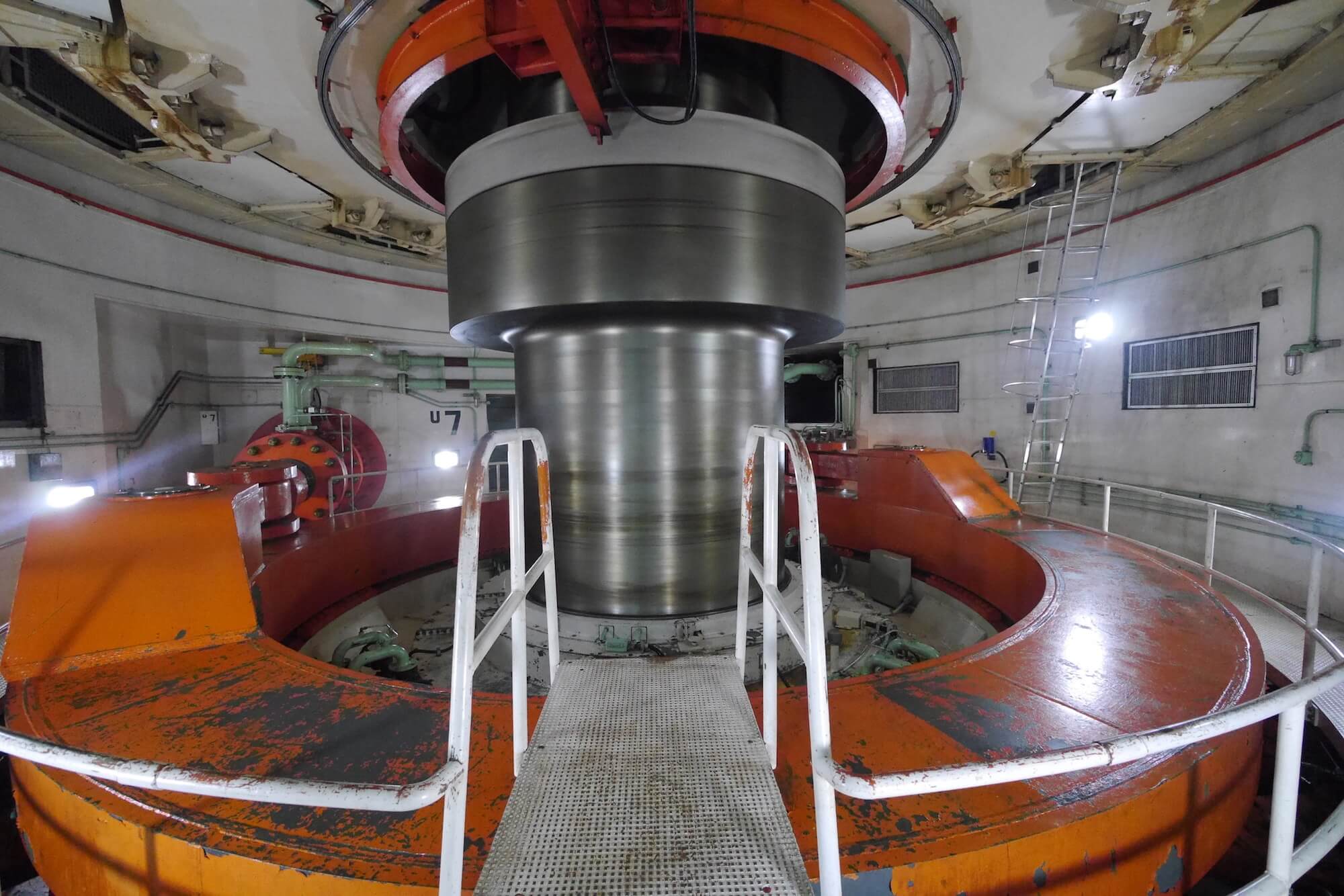 The floor runs the length of the concrete dam. Under each red cap is a turbine that weighs roughly 500,000 tonnes.