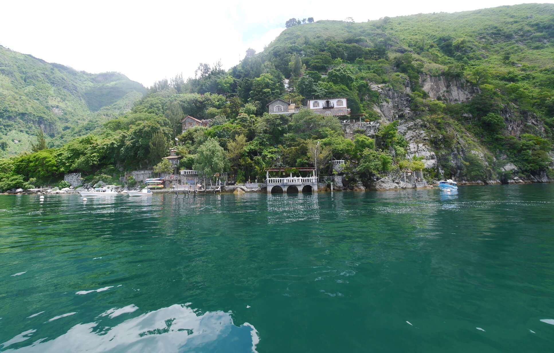 From the balconies of Cass del Mundo (House Of The World). Nestled in the north shore and only accessible by boat, this romantic getaway has several rooms as well as being open to day visitors. The food is a particular highlight. Access here is only by boat making a stay all that more exclusive. On warm days jump into the crystal clear blue waters of the lake from one of the sunken balconies before watching the sun set over San Pedro Volcano. You can also give your hiking boots a world out if you stay here. 3 trails lead away from the top of the hotel heading to Jaibalito, San Marcos and Santa Cruz.