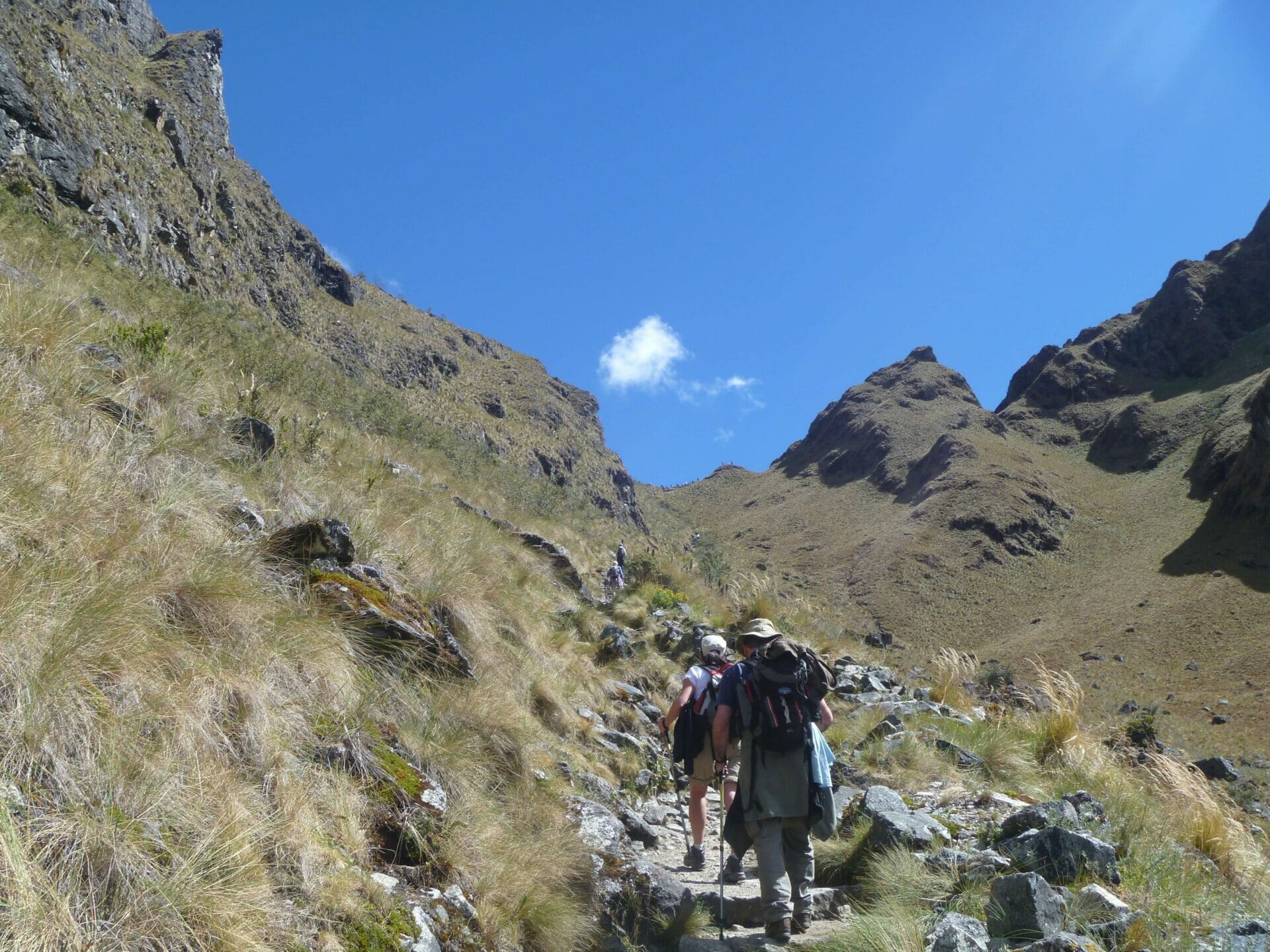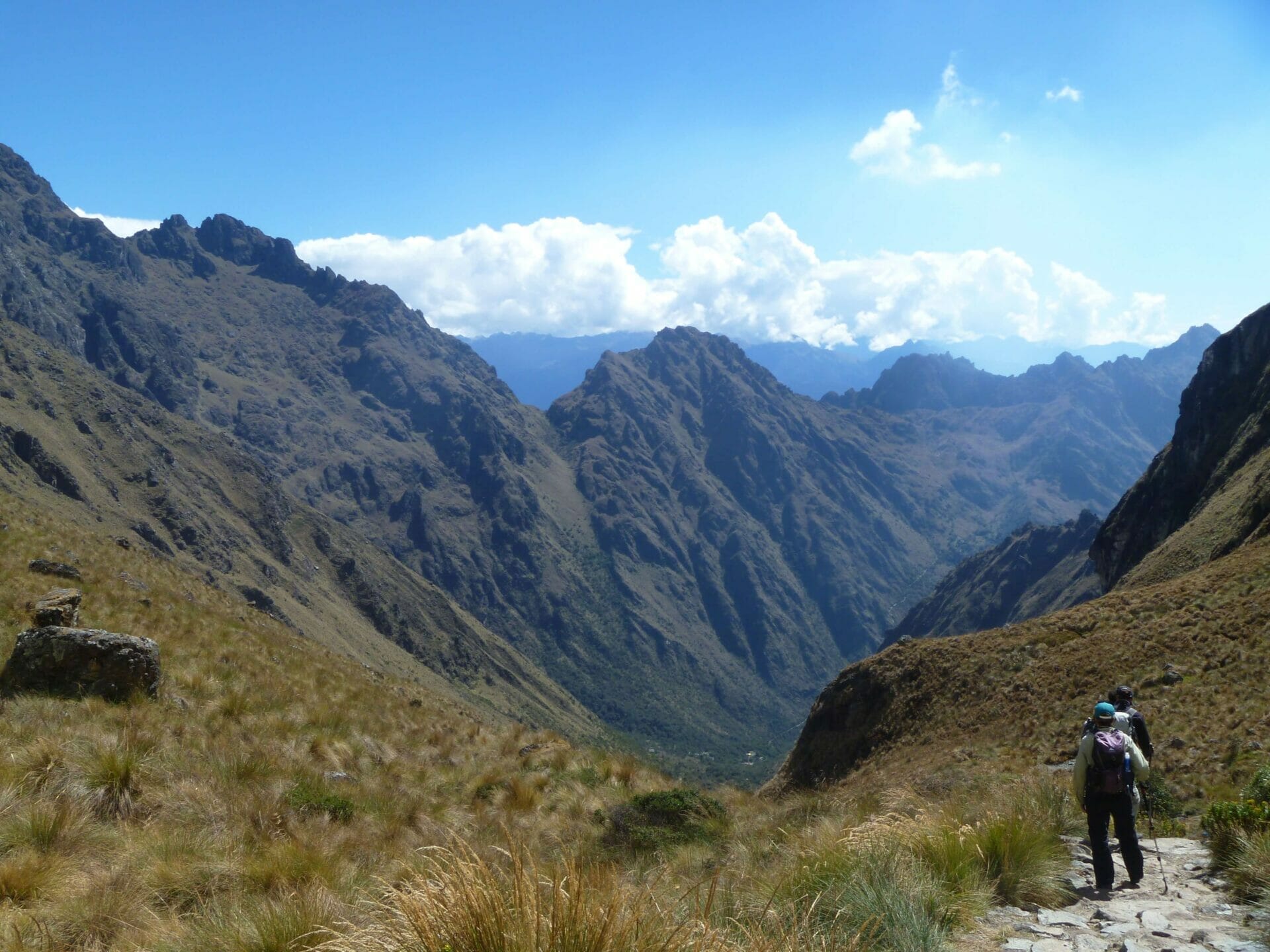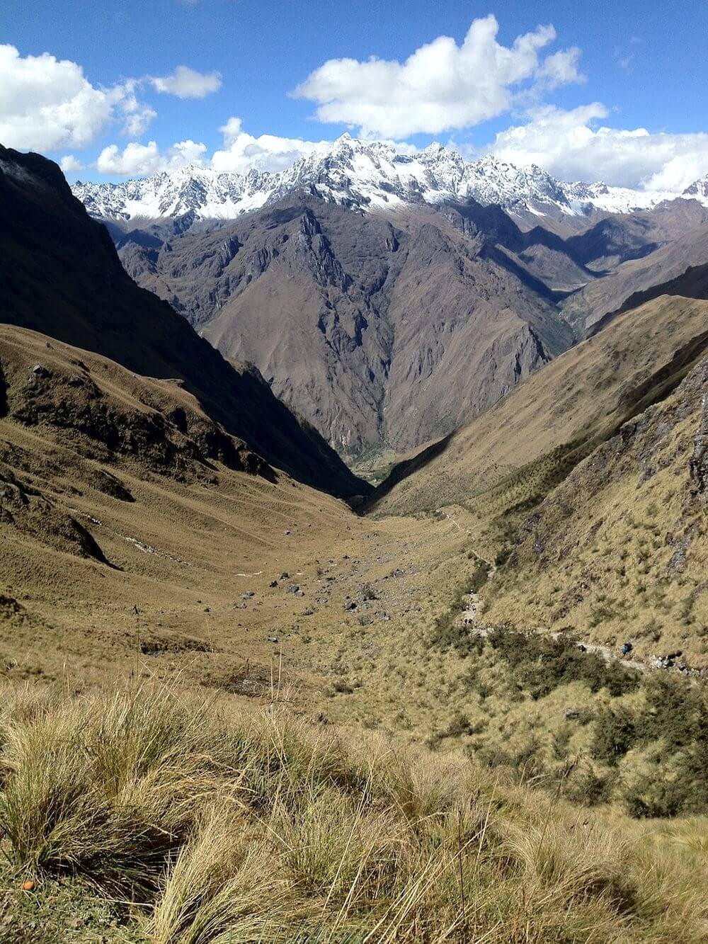 Hikers taking a moment to admire the view on the way down from Dead Womans Pass. You can just make out Paqaymayo camp in the valley.