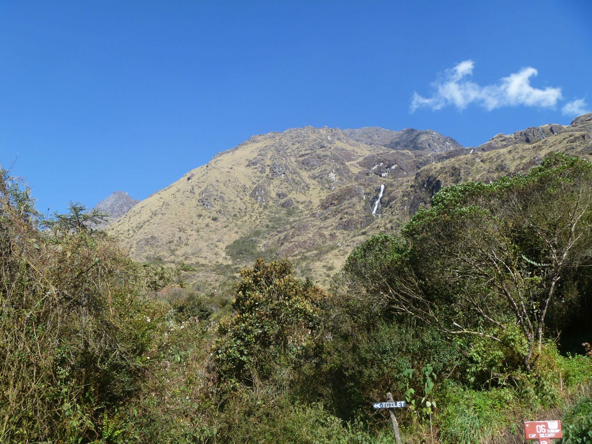 Looking up towards the peak we follow the cascading waterfall all the way down to our camp at Paqaymayo.